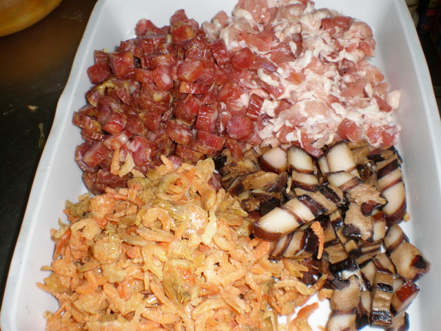 虾米浸水,腊肠,腊肉,腩肉切粒待用......