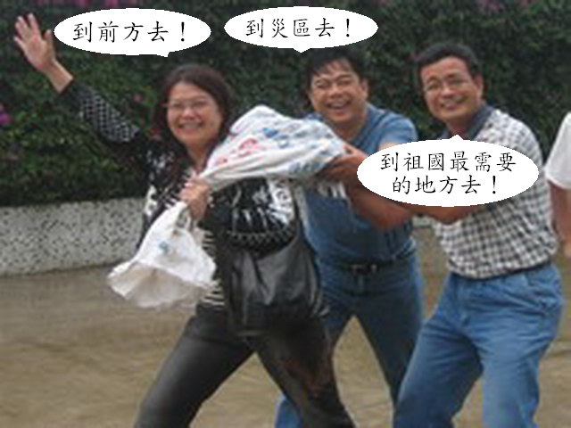 两位靓女, 系巧卖要我们还有老牛一起, 到灾区的前线去啰, 系巧聂去吗? 一于我就今天就返大陆(呆吾系车大炮哇)! 哈哈!