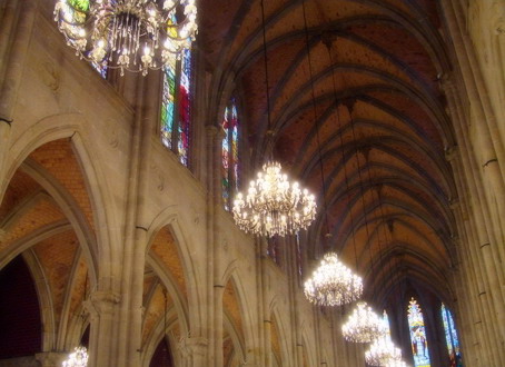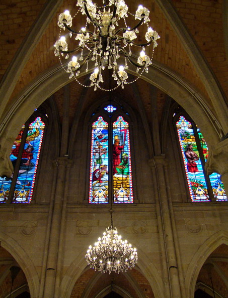 教堂内所有门窗都以法国制造的较深的红、黄、蓝、绿等