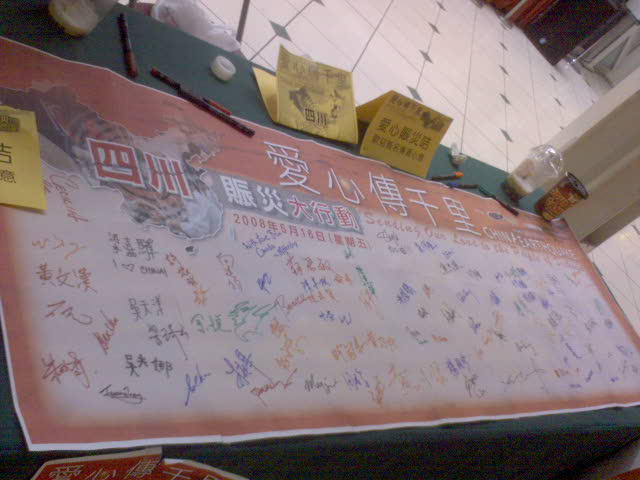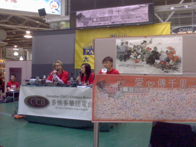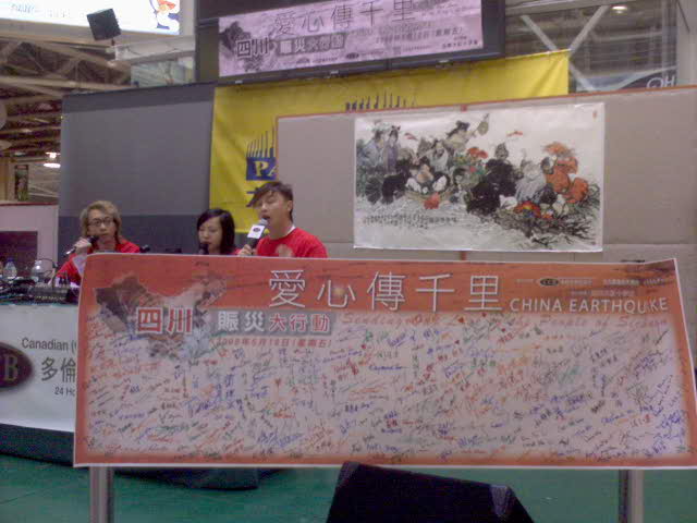 加拿大政府支持四川救灾,国民捐一元,政府也给一元.原香港歌星郑敬基在多伦多太古中心主持捐献。华侨捐钱签名!多伦多同学们快点来捐钱签返个名啦!我和女儿vivian也出点爱心!