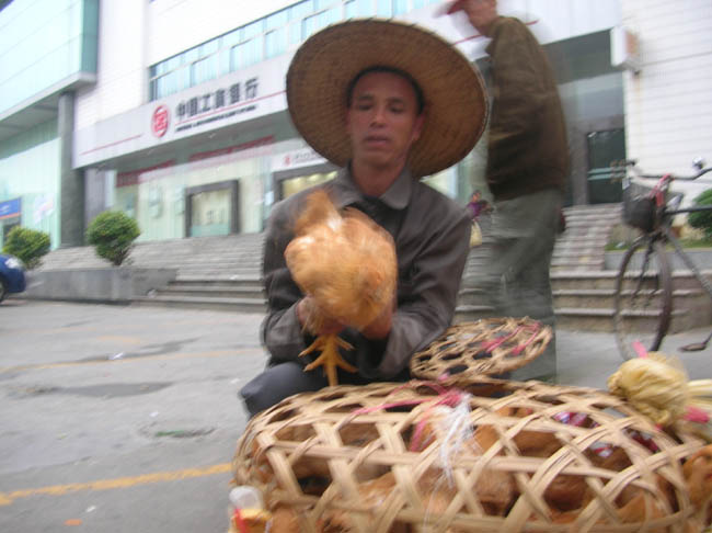 也许是受全球金融危机影响,菜市摊位要收费,竞争激烈,生意萧条难做,鸡贩竟然将“放山鸡”干脆摆在银行门外公开叫卖,每斤6元;这是今日下午在台城经过时所拍下的真实镜头。