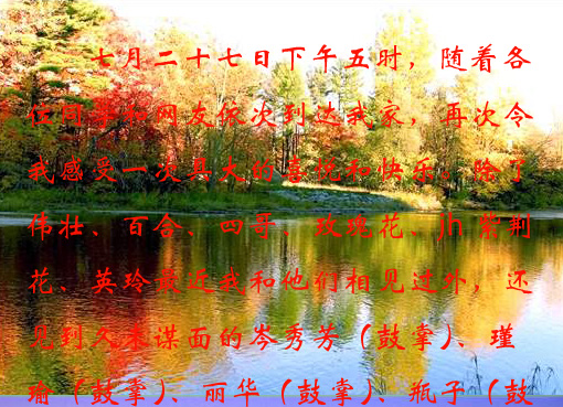 引用:原文由 kelly_hlp 发表:screen.width-300)this.width=screen.width-300\"> 蓝蓝,那天他们去看你的时候,由于我还在上班,不能一同过去看你。我让玫瑰代我为问候你,祝愿你天天都开开心心,身体健康!