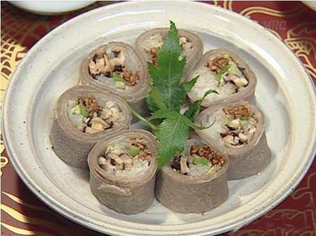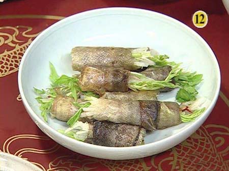 鱼皮水芹卷 “卷”是韩国很有特色的一种料理手法,比较常见的是紫菜卷饭,卷心菜卷海鲜、香肠。长今却不按常理出牌,把黑鱼皮完整片下,包裹胡萝卜、水芹菜等富含维生素的蔬菜,美容又营养。 帖子相关图片: