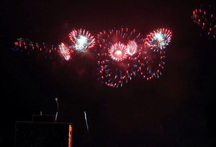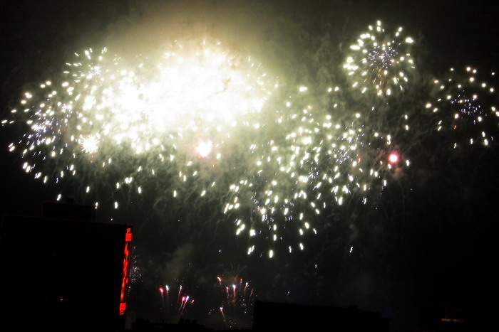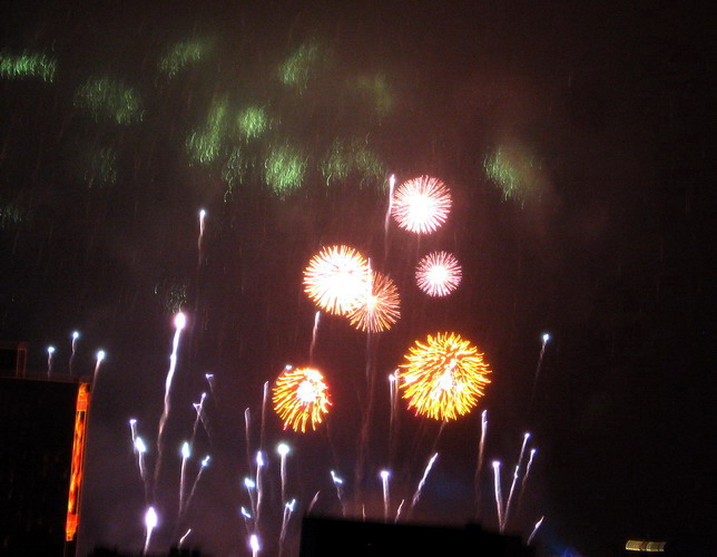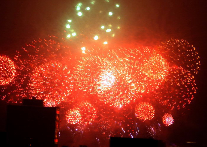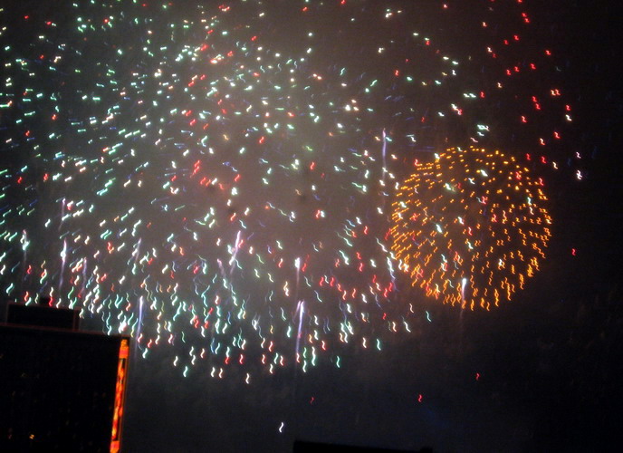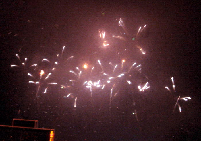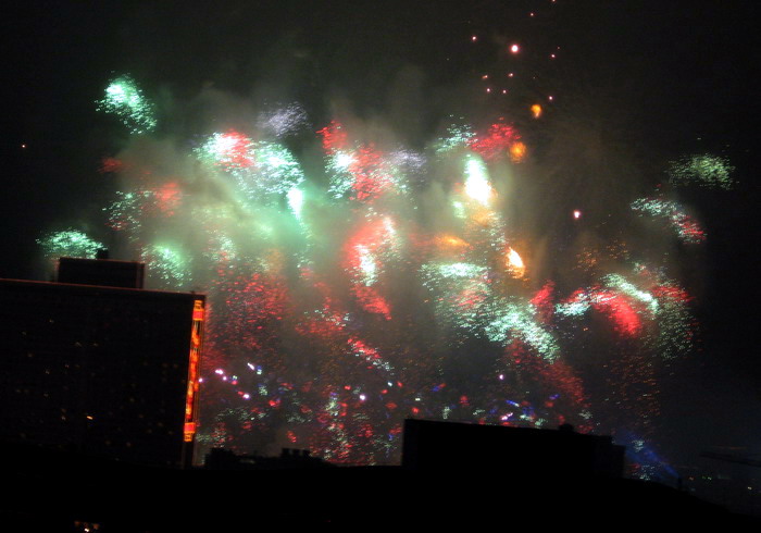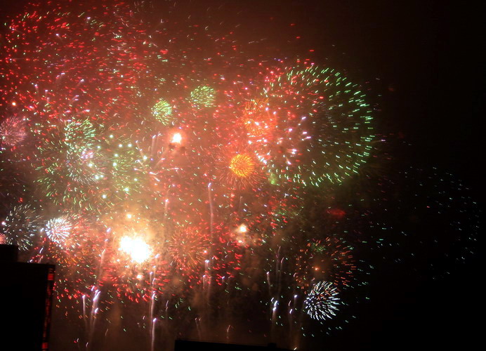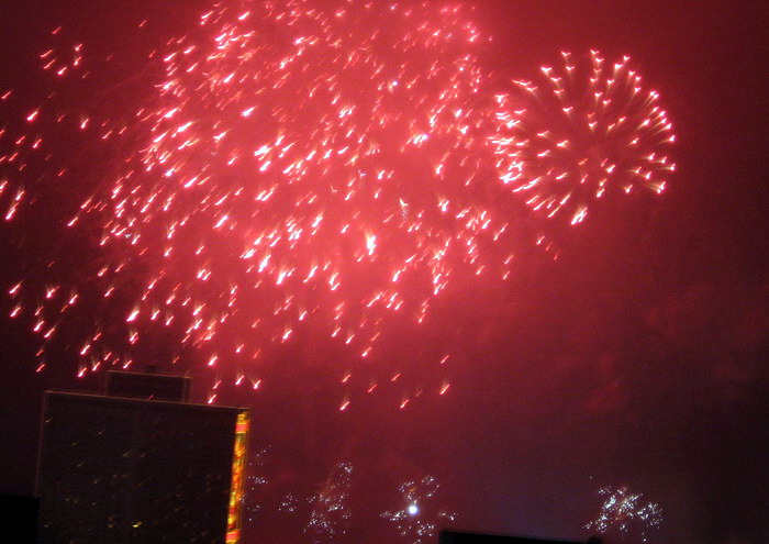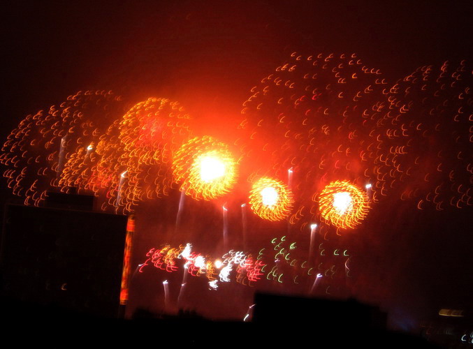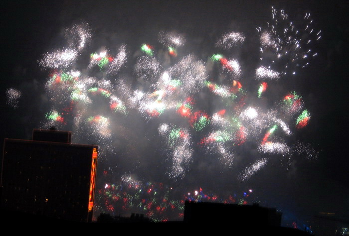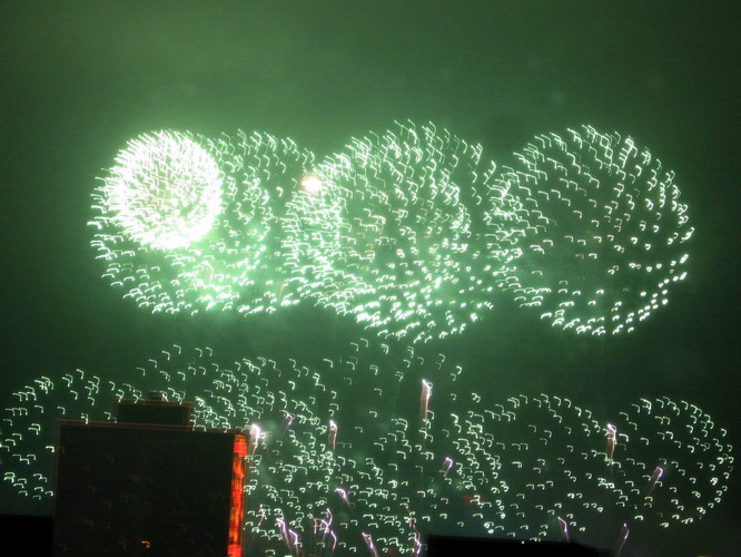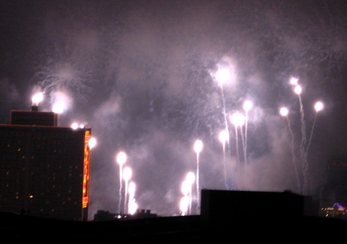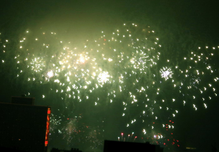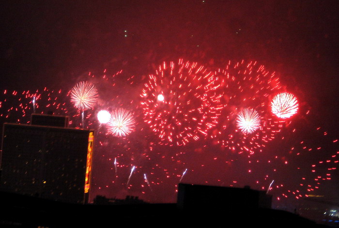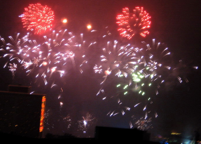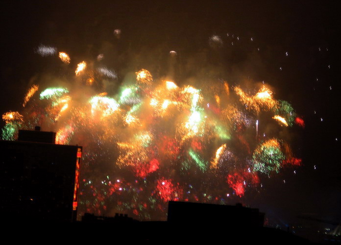 一年一度的大年初一放烟花, 珠江边能看到放烟花的地方都人头涌涌, 每年都是大年初一八点半, 一共半小时, 分开几个乐章, 随着音乐, 烟花分层次的开放, 不论是外地人或广州人, 都在那个时间不约而同地走到了珠江边, 观看那隆重的烟花展, 三点钟我就见到三首艠船停在珠江的中间, 准备着晚上的演出......, 虽然天气不是很好, 薄薄的霞暮笼罩着珠江, 可是并没有减退人们的观尚烟花的热情, 好在我家就是在离珠江不远的地放, 在家里的阳台就能看到了珠江放烟花的整个场面, 但是照相机不是专业机, 照得一般, 将就着看看气氛吧!......