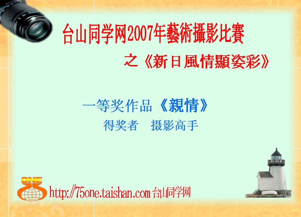 一等奖: 作品 No.66 《親情》 评委 DAN评语∶ 抓拍功力强. 人物的表情真实、自然,温暖. 主题突出生动,不但有人物大小对比,更有老幼共享天伦之乐。 评委 OLD5评语: 亲情: 主体突出,构图到位,偏冷的主调,和温暖的情调,恰到好处地勾画出祖孙二人亲情和谐的画面,看上去很舒服。 评委 解索者评语: 作品< 親情 > ,画面清 晰, 以非常真实 、生动感人 的人物表情;同时,在构图上利用人物 的大小、一老一少和色彩的深浅变化 分成两边对比构图,強烈突出了作品的主题 。 评委N丫Jimmy219 评語: 一等奖作品《親情》有着很強的主題意議 , 清晰的晝面令整體線條更丰富 , 人物更突出。捕捉的婆孫俩人物面部表情特寫, 鏡頭恰到好处, 相信作者在捕捉鏡頭的同時也付注了很大的感情"心由相生"。 评委:昨夜星辰 亲情---将老妇人与天真孩童想象为一对婆孙俩,平日我们身边事物此场景并未少见,人间真情无处不在,亲情、友情、爱情,作者抓拍到稍纵即逝婆孙互享亲情天伦之乐动人画面,人物表情丰富,层次分明且清哳度高,平行式构图给人详和、舒心感觉,从而构成一幅绝妙人间亲情画卷,更凸显新日风情姿采内涵。《亲情》高票胜出至情至理。
