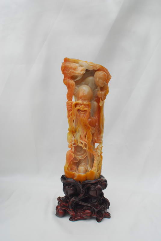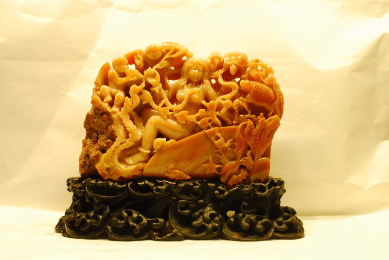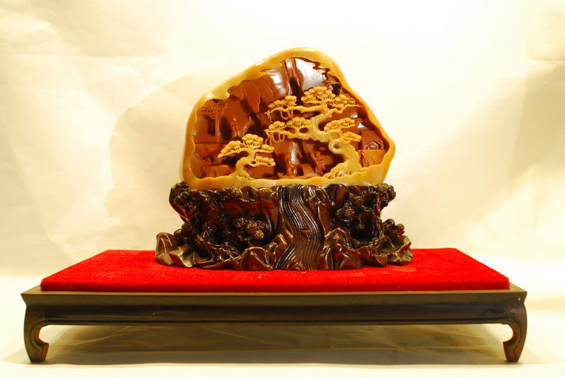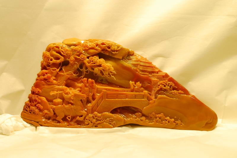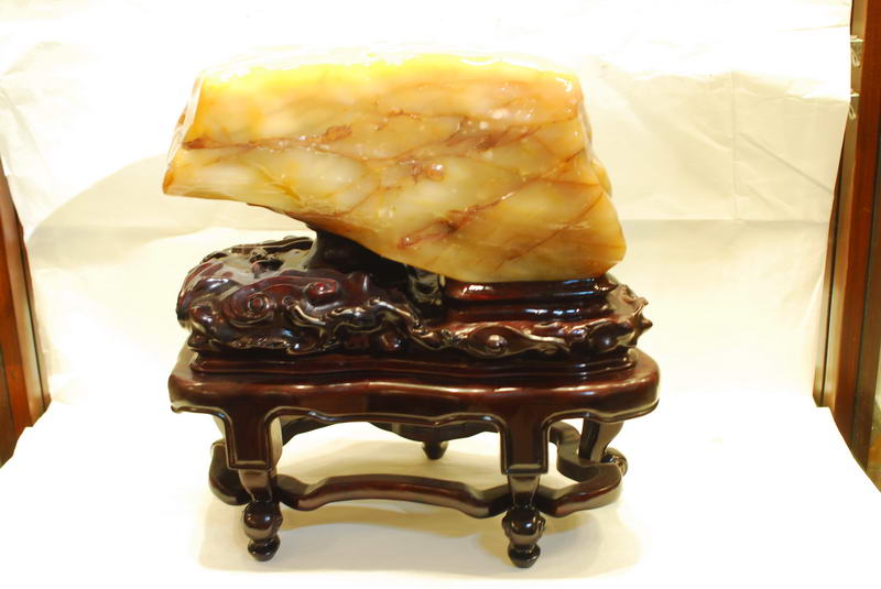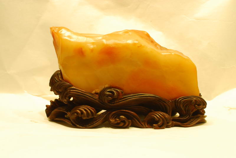 短短几年,这种美玉及其作品,因其质与玉同,石质温润,色彩斑斓,不但为远近玩玉界的人喜爱,更吸引了不少赏玩翡翠和福建寿山石的人前往购藏,更被赏石界叹为世间珍稀玉种。到今天,虽只短短十二个年头,其美名已传扬至台湾、东南亚、新疆,福建、上海、北京、广州、港澳、浙江等一带,深受玩家的青睐。至今,其质、色上乘者其价格已很高了,有的台湾赏石家见有的品种有如寿山田黄之韵,异常激动地惊呼“田黄”!因现在寿山田黄千金难求,将购得的有如寿山田黄的台山田黄当作寿山田黄赏玩,心里也有股满足感,甚至有的赏石家干脆称之为台山田黄,笔者也认同将产自黄花湾、散石湾、双耳坑、铜鼓坑、白石坑,三夹水等类似寿山田黄的石种称为“台山田黄”较合适,因产量也不算多,可让更多的赏石爱好者拥有“田黄”,这也是一种定性胸襟,因为寿山田黄有块头大的价值动辙上百万元,高价难求,而且资源将枯竭,它的天价是一般赏石家玩不起的,而后起之秀台山新田黄开始登基,让更多的赏石家拥有“田黄”,这也是一种和谐,一种平衡,缩短赏玩心理悬殊的差距,满足收藏爱好者的心理需求。也有的赏石家将可与寿山田黄石竞美的质色上乘的冻质台山田黄,冠以“石皇后”的美称,或者称为“皇后田黄”,将质色次之的台山田黄称为“贵妃田黄”,因为在古代皇宫里,皇后的身份是最高贵的,其次到皇妃。台山美石如果在古代被发现,也完全有条件被列为贡品。