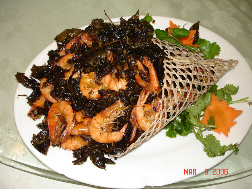 第二道菜是:家宅鸿运紫气来,所做的材料是:海虾,上川紫菜,
