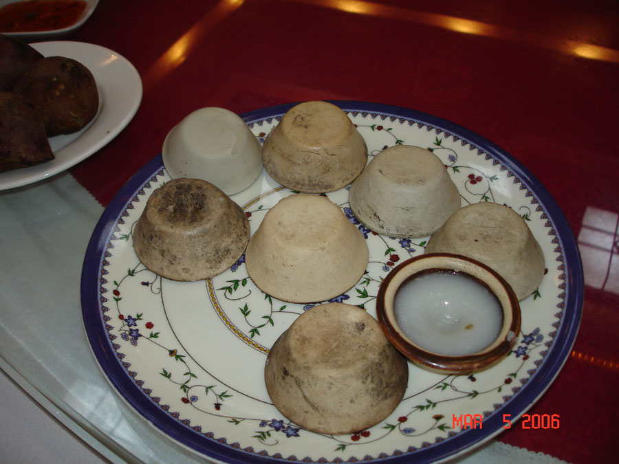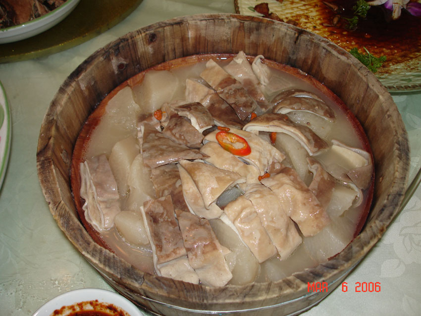 肚兔丐爽萝卜块,所做的材料是:猪肚,白箩卜,用木盆盛才突出台山乡土风味.
