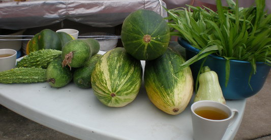 兄弟, 我绝冇夸张! 吾冇落一粒化肥! 每日子将穷 (三毫半子) 秋起来, 三天左右淋一次, 种瓜时我就先就将我家那\"A咪\"(我家的小狗)的跨下之物收将起来, 每种一棵瓜就先挖个\"坑\", 将那物体埋下去, 上面再种瓜苗, 丐时呆已收了十多个瓜, 纽约来的老朋每人两个南瓜一个节瓜带了回去, 他们来的那两天也是以自己种的瓜菜来招待, 他们吃了后都赞不绝口呢! 完全的绿色食物, 又是刚从地里摘下来的, 那南瓜(两种南瓜, 一种是粉的, 一中是脆的), 那油麦菜. 那通菜还有上汤苋菜! 真是好吃! 现在我家真的没买过菜了! 就是田里的菜都吃吾行! 我们种的青瓜又出瓜了! 苻鲁瓜, 就连西瓜都有好几个! 辣椒也长出来了, 有大的又有小的! 西红柿也长出来了! 有小种的也有大种的!