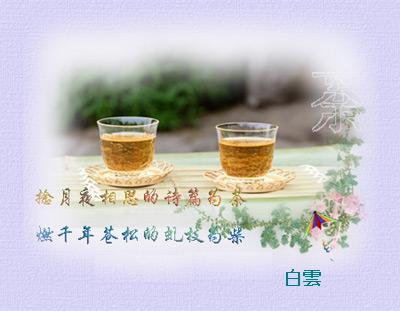 引用: 原文由 明月 发表于 2007-7-27 13:04:43 :引用: 原文由 白雲 发表于 2007-7-23 19:45:41 : 一片白云飘悠悠, 山涧清泉石上流。 高山一曲知音在, 淡茶一杯暖心留。(浣溪沙)答白雲淡茶一杯香味浓,晚霞片片艳阳红,对月浅醉心意融。高山一曲风吹松,人生百态各不同,茗茶品嚐乐无穷。 喜 茶 謝明月尘心欲随清香去,寂莫闲情品菊花,叩书方觉文墨浅,抚琴犹醒梦无涯。花露伴雪知茶趣,敲棋对友品紫霞,最爰踏歌云深处,一路吟行一路茶。