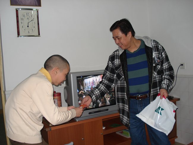 老鸡私家唐山2007系列报道 探访蔚蓝 昨天陪老鸡颠了一天,没上来发前天去蔚蓝家聚会的相片。 老鸡玩得尽兴时虽然有点疯癫疯癫,但做起正经事来很认真。又有爱心,带着鸡妹妹和几位网友去蔚蓝家作拜访,问寒问暖,送这送那的,很有爱心。 蔚蓝,鸡哥和鸡妹A包利是你,大个仔咯.