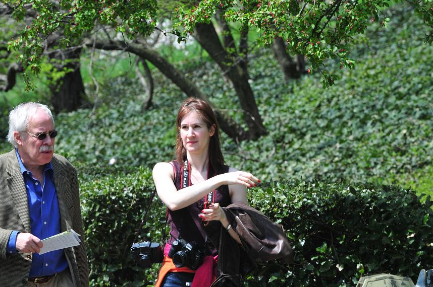 在公园里有很多摄影人,你看这个女士,膊子上挂着两台照相机:前面那台是