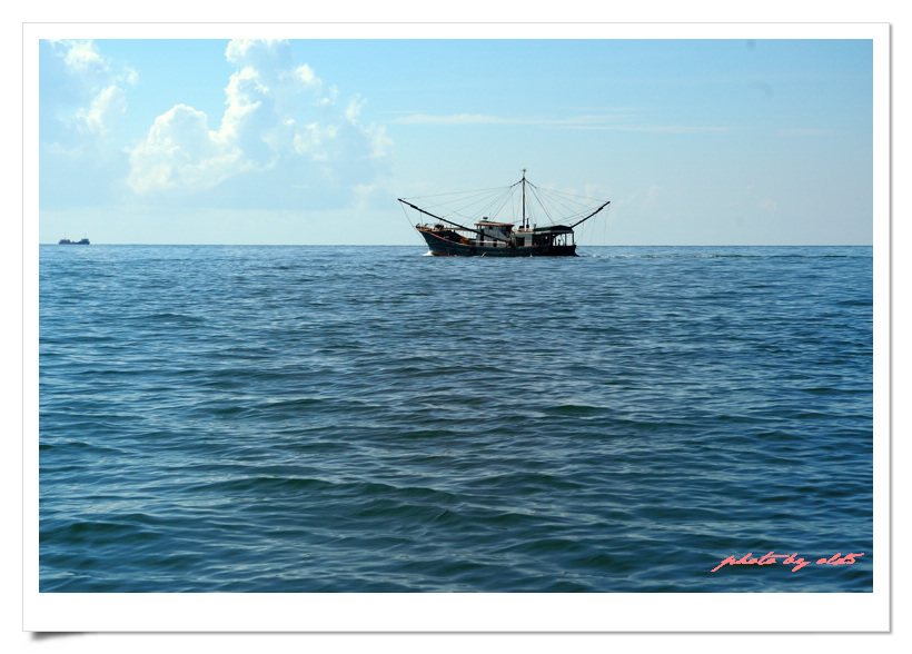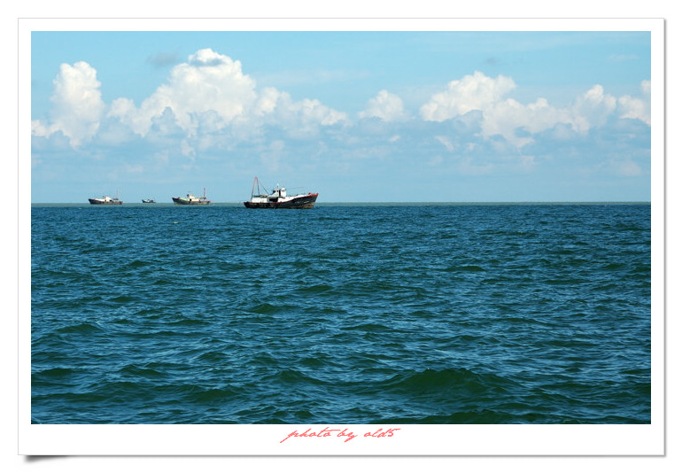 茫茫南海,画面中间最远方的三个小礁石就是著名三杯酒