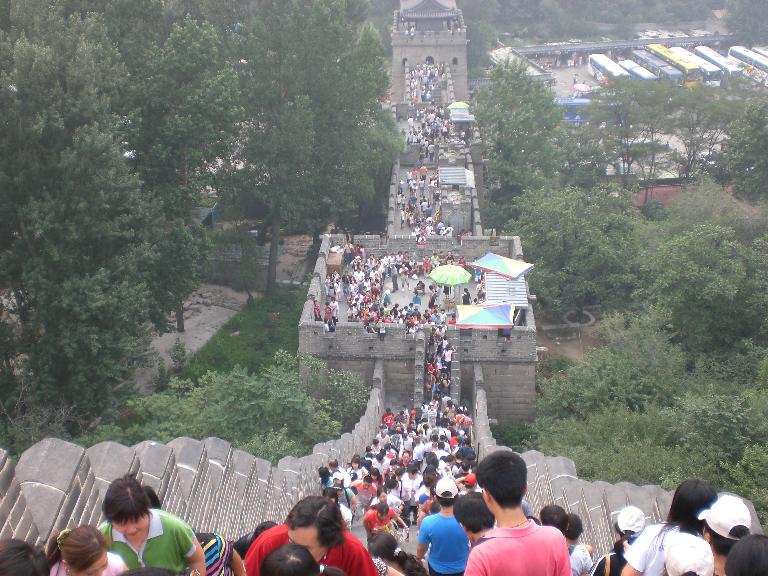 8月20日 昨天在登天安门城楼前排队托管包包的时候,有人在兜售纪念章与北京奥运会的纪念品,买六套毛主席像章与一大堆北京奥运会的纪念品才50块钱.又有人来搭讪派发旅游广告.他问:去了长城没有?我说:正计划去.他说:跟团去好,80块一天游全包.我浏览一下广告内容:八达岭长城.十三陵陵墓.明皇蜡像宫、九龙游乐园、小人国.古神道,皇家四合院,石牌坊.十三陵水库..往返车费.午餐费(八菜一汤)导游讲解免费接看升国旗,送太阳帽,纪念登长城文化衫,一天游DVD光盘.整天80元/人.学生半价.我疑惑,一天游团费会这么便宜吗?他说:\"旅游结束才付钱,绝不多收一分钱.你住哪里?\"我说台湾饭店.他说:我们中青旅是北京特许经营长城游的三家旅行社之一,你可千万别上黑团的当哦.我想:十一年前我来北京跟团一天游是15块钱.那年他们要我抱着女儿坐车,我想买多一张座位票他们死活也不肯卖.十年后物价上涨到80块也很合理,长城太远打的不合算,所以就参加长城一天游了. 按照约定的时间,今天先到天安门去看升旗仪式.早上四点钟,有人打电话来叫起床,约好30分钟后酒店门外接送.然后十分钟就被送到中青旅的大巴前集中,可是等了一个多小时,才上来一位穿一身黑衣的女子导游,她说:欢迎大家,我们旅行社是北京拿到特许经营的三大旅行社之一,你们选择参加我们的旅行团绝对是正确的,现在我先带大家去天安门观看升旗仪式,我想要大家明白的是,我们这么一大车人,不可能站在天安门广场观看升旗仪式,我们不用下车,就在车上观看,今天为我们开车是位经验丰富的司机,他会把握最佳的时机让大家看到升旗仪式.虽然距离天安门有一百米,坐车上居高临下观看挺舒服嘛.天啊~~摸黑出门等待两小时.我们只能遥望升旗仪式,待升旗仪式完毕后乘车缓缓经过天安门.升旗仪式我算是模模糊糊地看到了,但听不到庄严的国歌感受不到升国旗的肃目氛围所以写不出观感. 好啦~不管如何我们总算看到天安门的升旗仪式.\"如果想近距离看降旗仪式,自己傍晚再来.我们现在就直接去长城.去长城我们全程走高速大约需要一个多小时,我们旅行社租车一天是2500.....昨天业务员许诺的团费是骗大家的,无论之前谁跟你讲好价钱都不算数,因为你现在上的是我的车,为了保证旅行社的利润,所以你必需按我说的团费支付.\"导游这样硬梆梆的开场白,我真的是第一次见到.脸色不温和语气不友好.我想大概是犯职业病吧?可同是做旅行社的,我们小凡姑娘就亲切友好多了.黑衣女子导游说我根本不愿意带你们散客团,但按规定必需每月带两天散客团.看来这位导游没有进大学学过心理学,心里不愿意也没必要说出来倒游客的胃口,勉强出来工作还指望她礼待游客吗? 本来兴致勃勃的游客沉闷起来,我的心也凉了半载。我要是旅行社经理我非炒她鱿鱼不可.她接着说:\"我不 管你们是从酒店还是从景区被人送上我们的旅游巴士,你上了我的车就是我的人,归我管,无轮你是大款还是大官,今天你得听我的.你们都是聪明人,都听明白我所说的意思了吧?我必需先收钱,否则我担心我的工资不够补贴损失.当我走到你面前时希望你面带微笑交出钱\".....这不象明目张胆打劫吗?尽管我小心翼翼还是不幸跟上黑车旅行团.倒霉啊!一大早遇着这黑衣人真是活见鬼啦!看着巴士大名鼎鼎\"中青旅\"的字样,我怀疑.北京还有正规的旅行社吗?无奈骑虎难下我只好让“噩梦一样”的长城一日游继续吧。 不到长城非好汉.我们终于来到长城脚下,抬头一看,咦?怎么不是仰慕已久的“八达岭”?而是八达岭水关长城?真正的八达岭长城是明长城中保存最好的一段,也是最具代表性的一段,是明代长城的精华,是长城重要关口居庸关的前哨,海拔高达1015米,地势险要,城关坚固,历来是兵家必争之地.门票45块.而冒牌八达岭水关长城景区位于延庆县八达岭镇水关长城,门票仅20块.哎呀~又被导游忽悠了! 虽然是个廉价的景点,还是让第一次见到万里长城的孩子兴奋不已.八达岭水关长城的城墙用石条青砖依山而筑,山坡奇峰怪石,险峻陡峭,顶端内外两侧均有垛口,登上长城,极目远眺,俯首望去,群山起伏,万里长城犹如一条银色的巨龙飞舞在崇山峻岭之间,明长城的建筑风貌尽收眼底.导游规定,爬长城时间60分钟,过时不候,我吩咐女儿不要走太远. 60分钟后,我们被带往博览城玉器商场,在那里,我们成人每人领到一张写着数字的胸牌。工作人员透露,这个牌子是为了方便为旅游团统计购物游客的数量。实际上是按人数给旅行社回扣.从玉器商场出来,导游说:今天你们好运气了.我联系上了“小人国”,可以带大家去看“老中医”,那些“老中医”个个都很有来历,你们可以不尊重我但你们一定要敬重“老中医”.可实际“老中医”们个个除了会把脉还能察言观色,他们露骨地打探你来自贫困地区还是富裕地区,然后千篇一律说游客身体有这有那疾病,需要吃他们制作的中成药,价钱几百到几千.....不出家门什么都不知道,走出家门感到处处都是陷阱. 导游也知道应该带我们去十三陵陵墓参观.但她反复强调\":皇陵实际是阴宅,你们去到就会失望,只看四方形的棺木罢了,没什么意思.相术的话你不可不信,据说结婚3年以下的新婚夫妇、女人、小孩、上了年纪的人、病人、马上要升迁的人、生意正兴旺的人,都不能进去,不然不吉利!我带过一班游客去,有人刚出陵墓就莫名