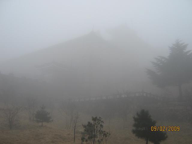 上面的相片是我在鳌鱼峰看到的光明顶,山谷中那个白墙灰顶的房子就是我们下榻的西海山庄(现在也叫白云宾馆)。