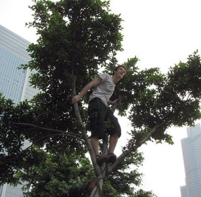 平凡人: 你哋估下?哩个鬼佬爬上棵树做乜呢?