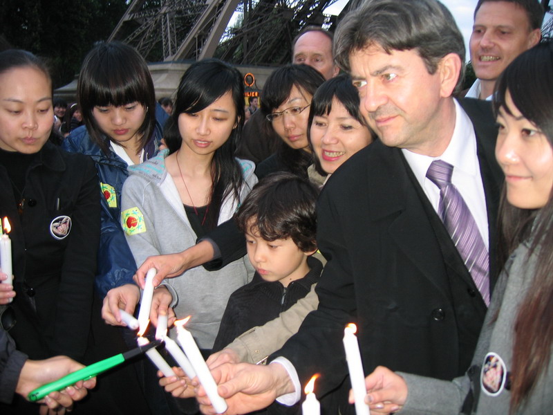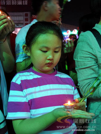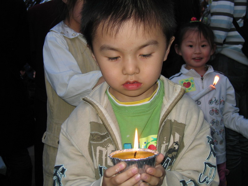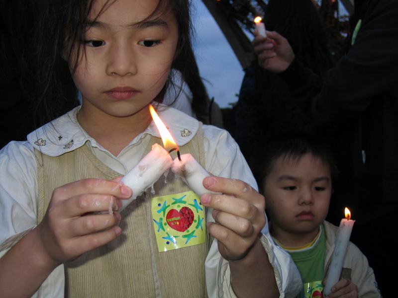 他们一起点燃烛光。为灾区同胞祈禱\!