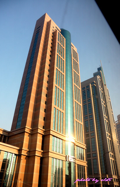 照片左边,白顶的国贸大厦是目前建成的我国最高楼;旁边绿顶的那座还在建的,建成之后将是世界第一高楼。