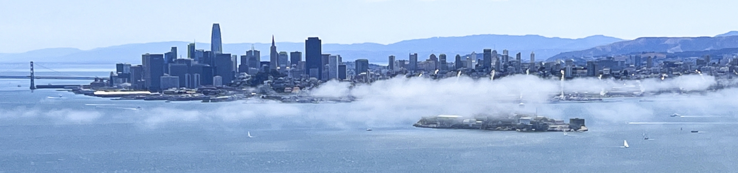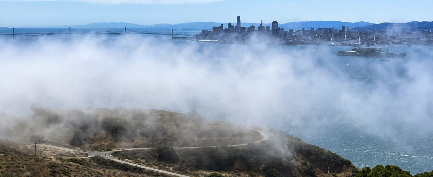 今天的天气是难得一遇的好,奥克兰湾区大桥,旧金山市区,金门大桥和马林县山区上空走动着轻纱般的云雾,每时每刻变换出不同的美景。